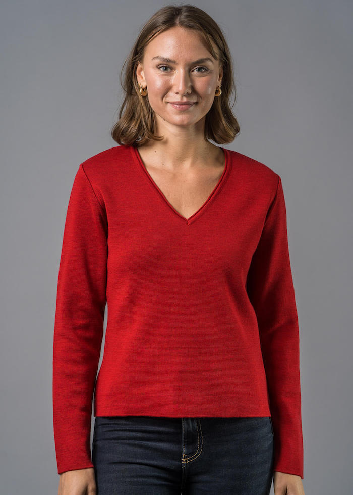 Der Damenpullover in rot ist ein rein in Europa gefertigtes Produkt. Die Wolle (Strickgarn) kaufen wir in Italien bei Baruffa, Tollegno oder Miroglio. Gestrickt und genäht wird Beate in Serbien oder Slovenien. Das sorgt für kurze Wege – gut für den Planeten und damit auch für Dich.