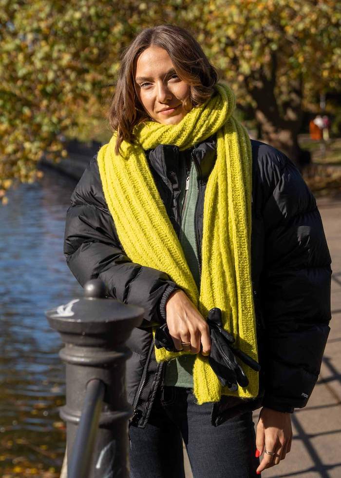 Hauke ist ein leichter Connemara Schal neongelb, in Rippe gestrickt. Das spezielle Garn aus Merinowolle, Baby-Alpaka und einem kleinen Anteil Polyamid ist extrem leicht und hat dabei ein unglaubliches Volumen. Dadurch kann das Gestrick wiederum kann ganz viel Luft einschließen, hält super warm und fühlt sich sehr sehr kuschelig an.